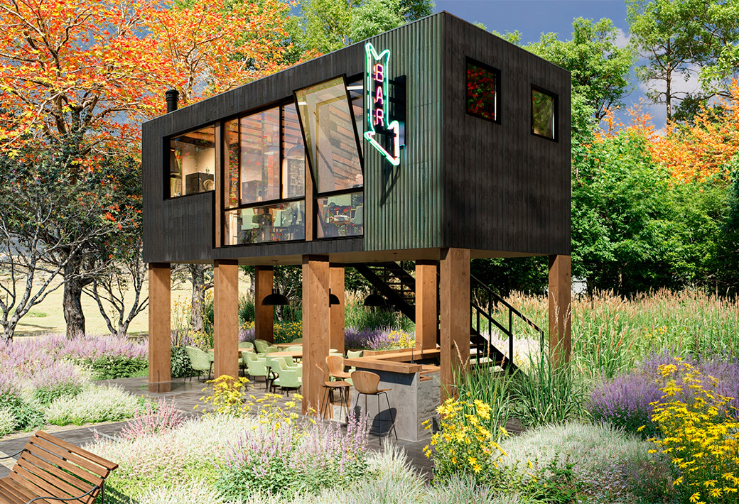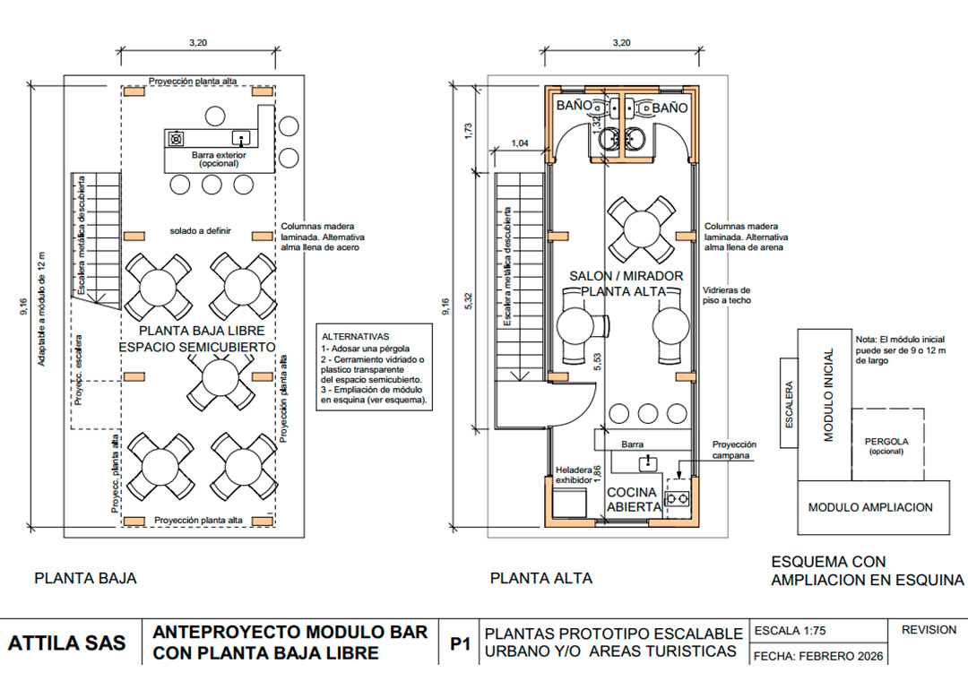 Además, el Bar Modular Attila es un sistema escalable, lo que significa que el proyecto puede crecer por etapas según las necesidades del emprendimiento. Esto permite comenzar con un núcleo funcional y, a medida que el negocio se desarrolla, incorporar nuevos módulos o ampliar los espacios de atención al público sin necesidad de realizar grandes obras.